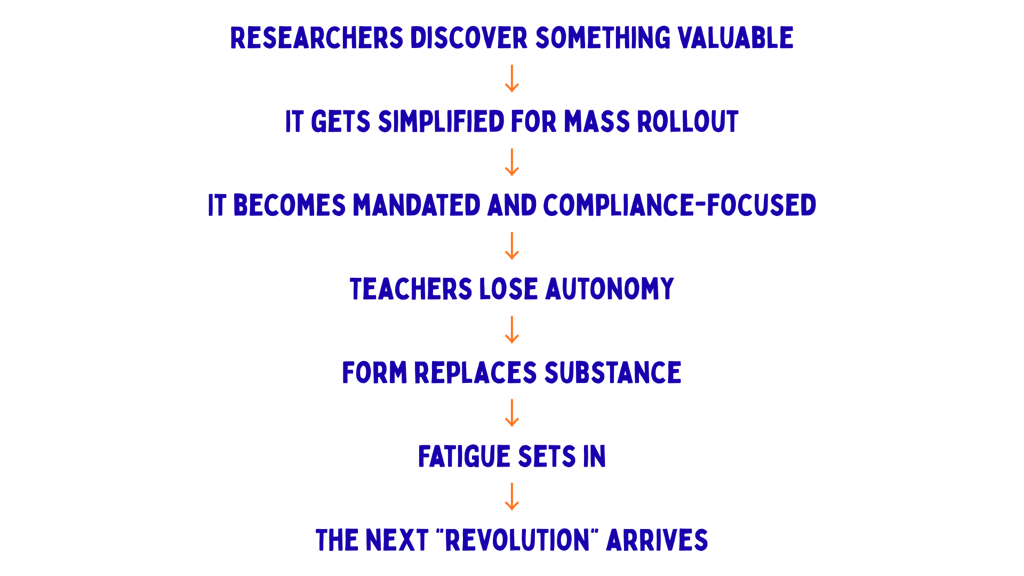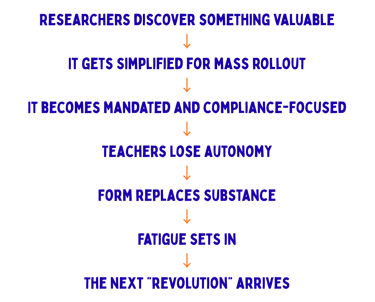 Each one was supposed to revolutionise teaching. Each one was based on genuine insights. And each one became bureaucratised, mandated, template-driven, and eventually divorced from actual thinking about learning.